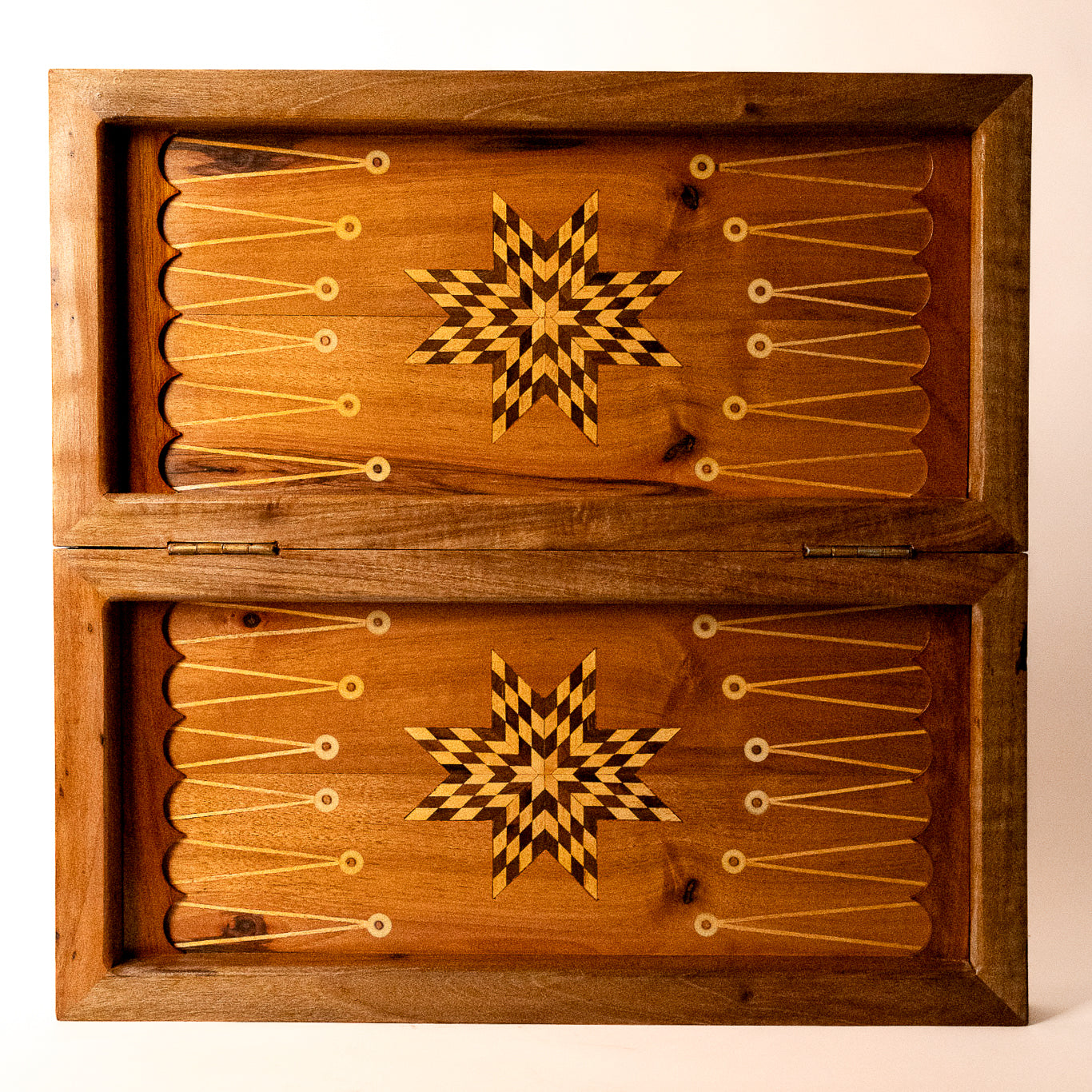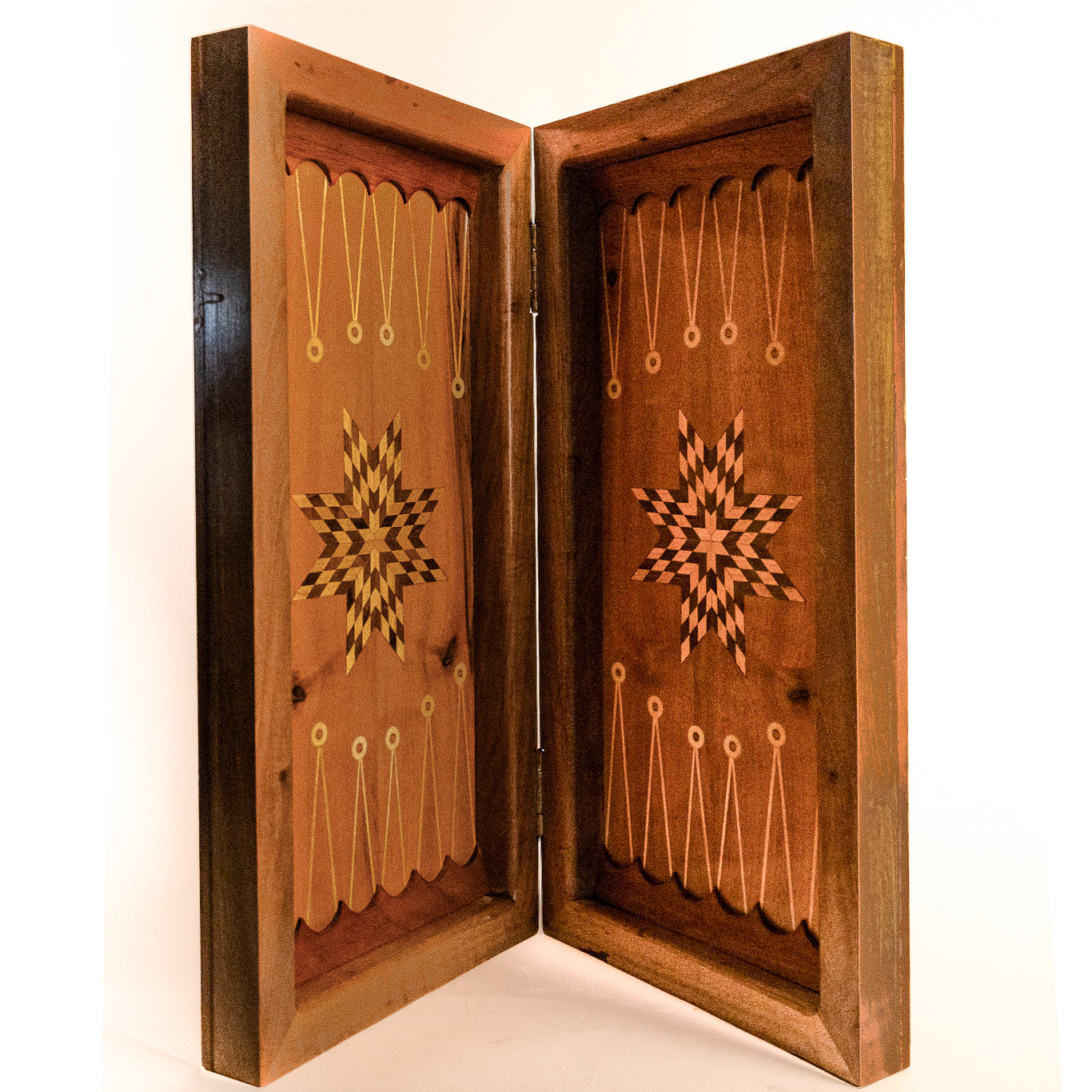 - Dual Hinged Layout: The board folds open to reveal two distinct playing fields, each adorned with finely detailed points and beautifully contrasting colors for an enhanced visual experience.
