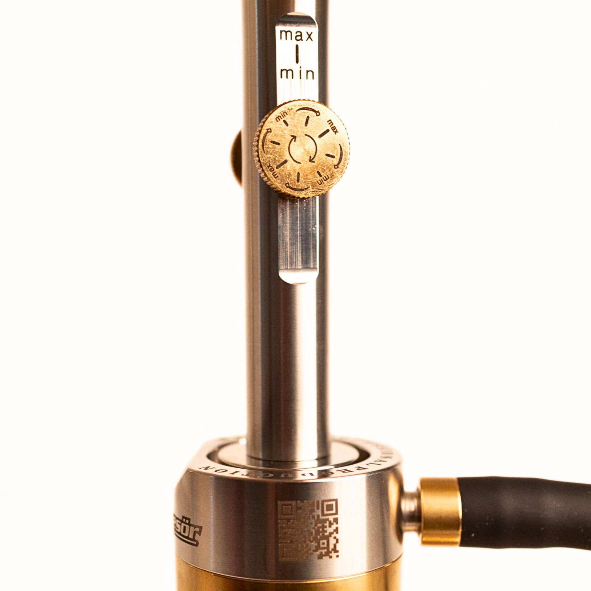 Introducing the E38 Kompressor Plus, a remarkable blend of durability and style in the world of hookahs. This model, standing at 45 cm and weighing 3240g, is a testament to the innovative craftsmanship of Mr.Eds. Combining stainless steel and titanium, the E38 Kompressor Plus is designed for those who appreciate the finer things in life.